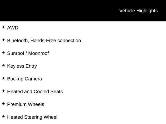 AWD, Bluetooth, Hands-Free connection, Sunroof / Moonroof, Keyless Entry, Backup Camera, Heated and Cooled Seats, Premium Wheels, Heated Steering Wheel, AWD.