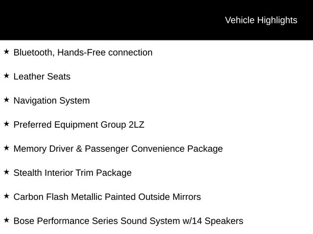 Bluetooth, Hands-Free connection, Leather Seats, 2 Cargo Nets, Bose Performance Series Sound System w/14 Speakers, Carbon Flash Metallic Painted Outside Mirrors, Carbon Flash Metallic-Painted Outside Mirrors, Driver Power Bolster Seat Adjuster, Electrical Theft Deterrent System, HD Front & Rear Vision Cameras, Heated & Vented Driver & Passenger Seats, Heated Steering Wheel, Memory Driver & Passenger Convenience Package, Navigation System, Passenger Power Bolster Seat Adjuster, Performance Data & Video Recorder, Power Driver Lumbar Control Seat Adjuster, Power Passenger Lumbar Control Seat Adjuster, Power-Adjustable Outside Heated Mirrors, Preferred Equipment Group 2LZ, Rear Cross Traffic Alert, Side Blind Zone Alert, Stealth Interior Trim Package, Universal Home Remote, Vehicle Inclination Theft Deterrent Sensor, Vehicle Interior Movement Theft Deterrent Sensor, Wireless Charging for Devices.
