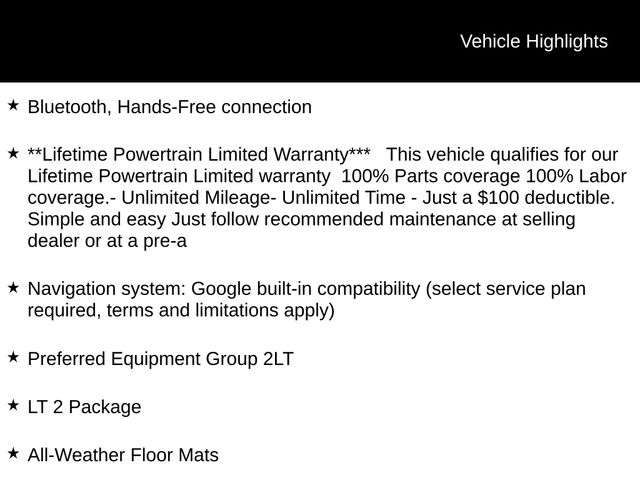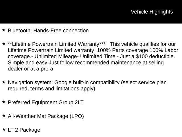Bluetooth, Hands-Free connection, **Lifetime Powertrain Limited Warranty*** This vehicle qualifies for our Lifetime Powertrain Limited warranty 100% Parts coverage 100% Labor coverage.- Unlimited Mileage- Unlimited Time - Just a $100 deductible. Simple and easy Just follow recommended maintenance at selling dealer or at a pre-a, All-Weather Floor Mats, LT 2 Package, Navigation system: Google built-in compatibility (select service plan required, terms and limitations apply), Preferred Equipment Group 2LT.