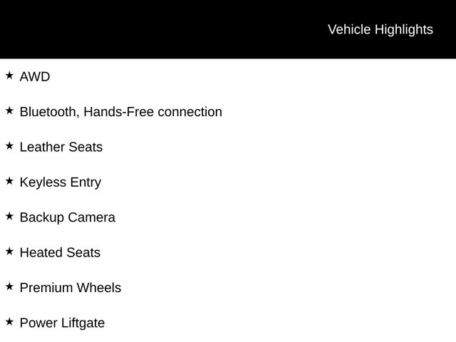 AWD, Bluetooth, Hands-Free connection, Leather Seats, Keyless Entry, Backup Camera, Heated Seats, Premium Wheels, Power Liftgate.
