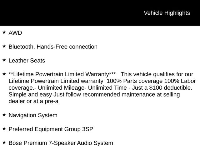 AWD, Bluetooth, Hands-Free connection, Leather Seats, **Lifetime Powertrain Limited Warranty*** This vehicle qualifies for our Lifetime Powertrain Limited warranty 100% Parts coverage 100% Labor coverage.- Unlimited Mileage- Unlimited Time - Just a $100 deductible. Simple and easy Just follow recommended maintenance at selling dealer or at a pre-a, Bose Premium 7-Speaker Audio System, Max Range Battery Pack, Navigation System, Preferred Equipment Group 3SP, Radio: 17.7" Diagonal Advanced Color LCD Display, Steering wheel mounted audio controls.