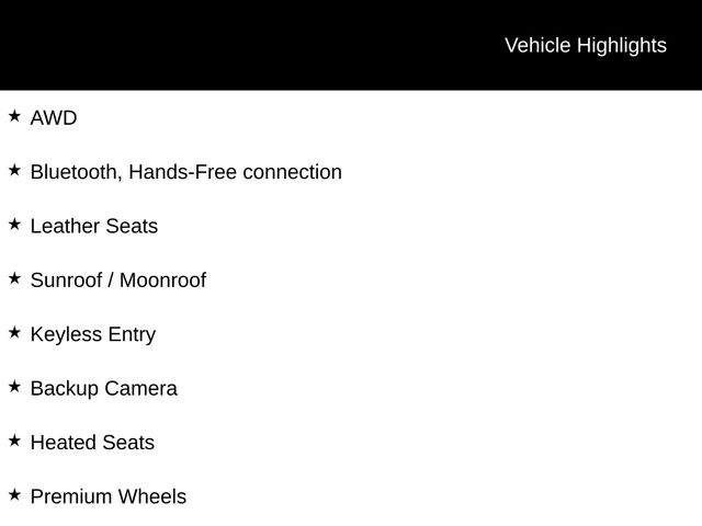 AWD, Bluetooth, Hands-Free connection, Leather Seats, Sunroof / Moonroof, Keyless Entry, Backup Camera, Heated Seats, Premium Wheels, Power Liftgate.