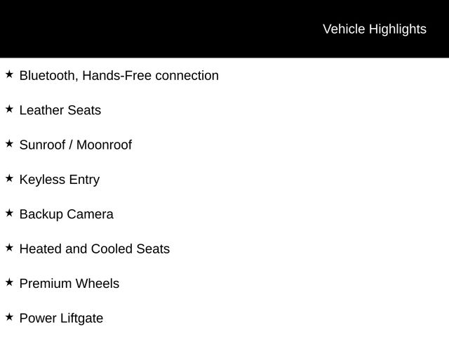 Bluetooth, Hands-Free connection, Leather Seats, Sunroof / Moonroof, Keyless Entry, Backup Camera, Heated and Cooled Seats, Premium Wheels, Power Liftgate, Heated Steering Wheel.