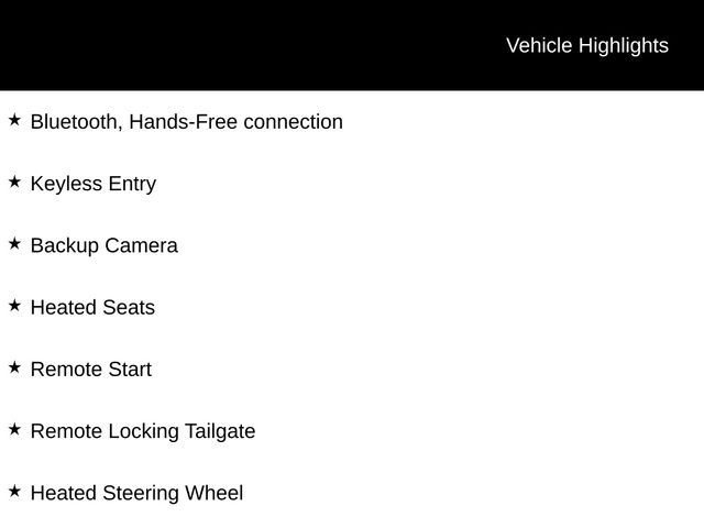 Bluetooth, Hands-Free connection, Keyless Entry, Backup Camera, Heated Seats, Remote Start, Remote Locking Tailgate, Heated Steering Wheel, 4WD.