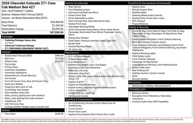 Tax, title, license and $249.00 document preparation fee are extra. Pricing will not include additional installed accessories. Not available with special finance or lease offers. We make every reasonable effort possible to present information and pricing that is true and accurate. Some information provided may come from third party sources. To ensure your complete satisfaction, please verify the accuracy prior to your purchase. It is the responsibility of the consumer to verify the accuracy of information listed. . See dealer for details. Dealer is not responsible for typographical or other errors in pricing. Price may not include installed accessories. Price includes: *$1750 - GM Consumer Cash Program. Applies To All Consumers Exp. 01/02/2026