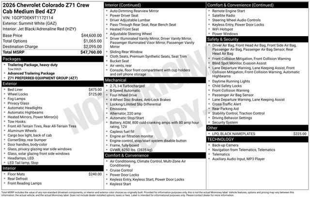Tax, title, license and $249.00 document preparation fee are extra. Pricing will not include additional installed accessories. Not available with special finance or lease offers. We make every reasonable effort possible to present information and pricing that is true and accurate. Some information provided may come from third party sources. To ensure your complete satisfaction, please verify the accuracy prior to your purchase. It is the responsibility of the consumer to verify the accuracy of information listed. . See dealer for details. Dealer is not responsible for typographical or other errors in pricing. Price may not include installed accessories. Price includes: *$1000 - GM Consumer Cash Program. Applies To All Consumers Exp. 03/31/2026