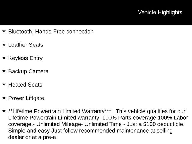 Bluetooth, Hands-Free connection, Leather Seats, Keyless Entry, Backup Camera, Heated Seats, Power Liftgate.