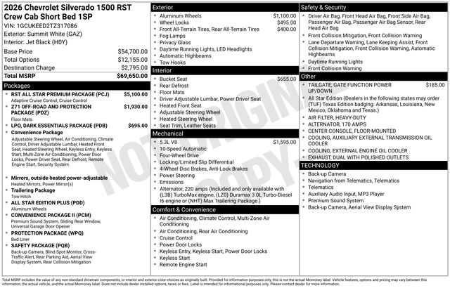 Tax, title, license and $249.00 document preparation fee are extra. Pricing will not include additional installed accessories. Not available with special finance or lease offers. We make every reasonable effort possible to present information and pricing that is true and accurate. Some information provided may come from third party sources. To ensure your complete satisfaction, please verify the accuracy prior to your purchase. It is the responsibility of the consumer to verify the accuracy of information listed. . See dealer for details. Dealer is not responsible for typographical or other errors in pricing. Price may not include installed accessories. Price includes: $1500 - Chevrolet Bonus Cash. Exp. 03/31/2026 *$3250 - GM Consumer Cash Program. Applies To All Consumers Exp. 03/31/2026