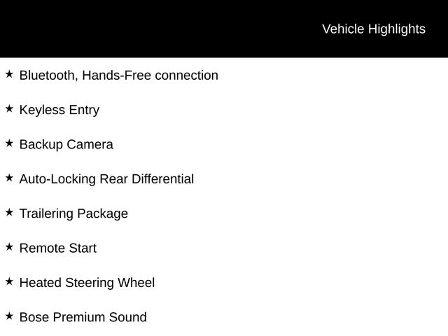 Bluetooth, Hands-Free connection, Keyless Entry, Backup Camera, Auto-Locking Rear Differential, Trailering Package, Remote Start, Heated Steering Wheel, Bose Premium Sound, Spray-On Bedliner, Power Tailgate, 10-Speed Automatic, 4WD, Jet Black Leather.