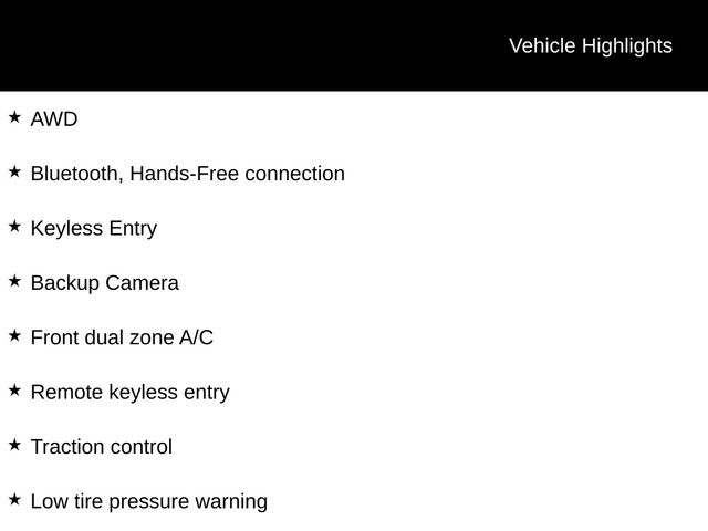 AWD, Bluetooth, Hands-Free connection, Keyless Entry, Backup Camera, ABS brakes, Active Cruise Control, Alloy wheels, Electronic Stability Control, Front dual zone A/C, Heated door mirrors, Heated front seats, Low tire pressure warning, Remote keyless entry, Traction control.