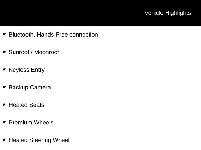 Bluetooth, Hands-Free connection, Sunroof / Moonroof, Keyless Entry, Backup Camera, Heated Seats, Premium Wheels, Heated Steering Wheel.