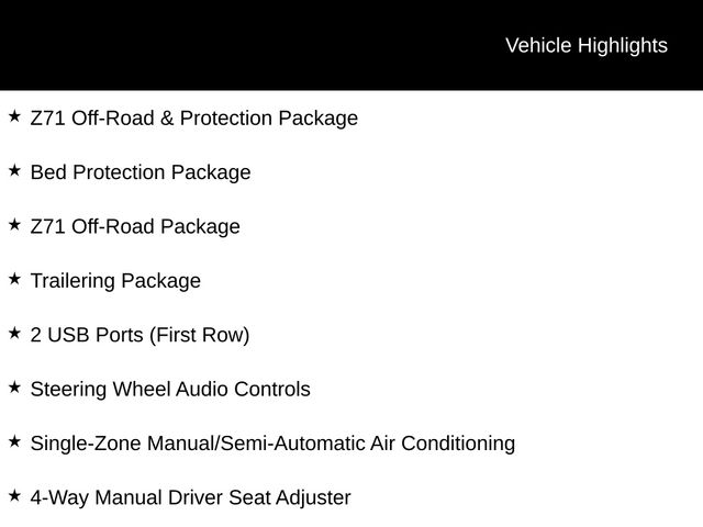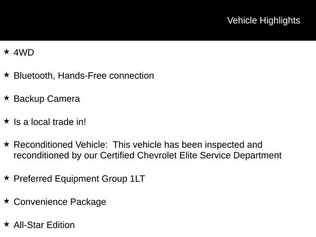 4WD, Bluetooth, Hands-Free connection, Backup Camera, Is a local trade in!, Reconditioned Vehicle: This vehicle has been inspected and reconditioned by our Certified Chevrolet Elite Service Department, 8-Speed Automatic, 4WD, Black Cloth, 2 USB Ports (First Row), 4-Way Manual Driver Seat Adjuster, 4.2" Diagonal Color Display Driver Info Center, All-Star Edition, All-Weather Floor Liner (LPO) (AAK), Bed Protection Package, Bluetooth For Phone, Chevytec Spray-On Black Bedliner, Chrome Grille, Chrome Mirror Caps, Color-Keyed Carpeting Floor Covering, Compass, Convenience Package, Deep-Tinted Glass, Dual Exhaust w/Polished Outlets, Electronic Cruise Control, Front Frame-Mounted Black Recovery Hooks, Front Rubberized Vinyl Floor Mats, Heavy-Duty Rear Locking Differential, High Capacity Air Filter, Hill Descent Control, Locking Tailgate, Manual Tilt Wheel Steering Column, Off-Road Suspension, OnStar & Chevrolet Connected Services Capable, Power Door Locks, Power Front Windows w/Driver Express Up/Down, Power Front Windows w/Passenger Express Down, Power Rear Windows w/Express Down, Preferred Equipment Group 1LT, Rear 60/40 Folding Bench Seat (Folds Up), Rear Rubberized-Vinyl Floor Mats, Rear Vision Camera, Rear Wheelhouse Liners, Remote Keyless Entry, Single-Zone Manual/Semi-Automatic Air Conditioning, Steering Wheel Audio Controls, Trailering Package, Urethane Steering Wheel, Z71 Off-Road & Protection Package, Z71 Off-Road Package.