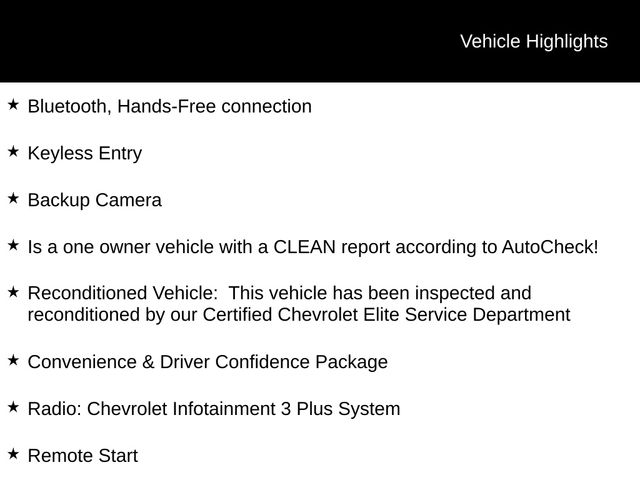 - Reconditioned Vehicle: This vehicle has been inspected and reconditioned by our Certified Chevrolet Elite Service Department