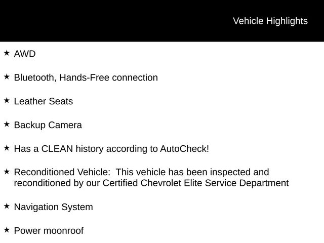AWD, Bluetooth, Hands-Free connection, Leather Seats, Backup Camera, Has a CLEAN history according to AutoCheck!, Reconditioned Vehicle: This vehicle has been inspected and reconditioned by our Certified Chevrolet Elite Service Department, Navigation System, Power Liftgate, Power moonroof.